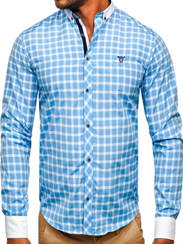 Herren Langarm Hemd Elegant Kariert Azurblau Bolf 5737-1